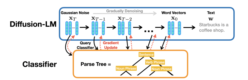 plug-and-play controllable generation 방식은 먼저 언어모델을 freeze시키고, external classifier를 사용하여 해당 언어모델의 생성 방식을 조종하는 방식으로 볼 수 있습니다. 기존 연구들은 단순한 attribute-level의 control은 가능했으나, syntax parse tree나 syntax length와 같은 복잡한 syntactic structure-wise control은 다루고 있지 않습니다. 이 문제를 해결하기 위해, 해당 연구는 diffusion model을 기반으로 한 non-autoregressive language model인 Diffusion-LM을 제안합니다. 해당 모델을 plug-and-play controllable generation 방식으로 기존의 단순한 control뿐만 아니라 fine-grained control들을 수행할 수 있다고 합니다.